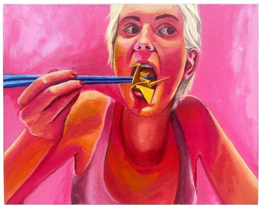 Essa apropriação do símbolo revela tensões entre desejo, projeção e identidade. A figura, que é semelhante a artista, adiciona um viés quase antropofágico à cena, como se, enquanto devorasse o tsuru, absorvesse aquilo que poderia a transformar ou libertar. O corpo que come também é o corpo que se transforma. Uma tentativa de domínio sobre o que nos atravessa.